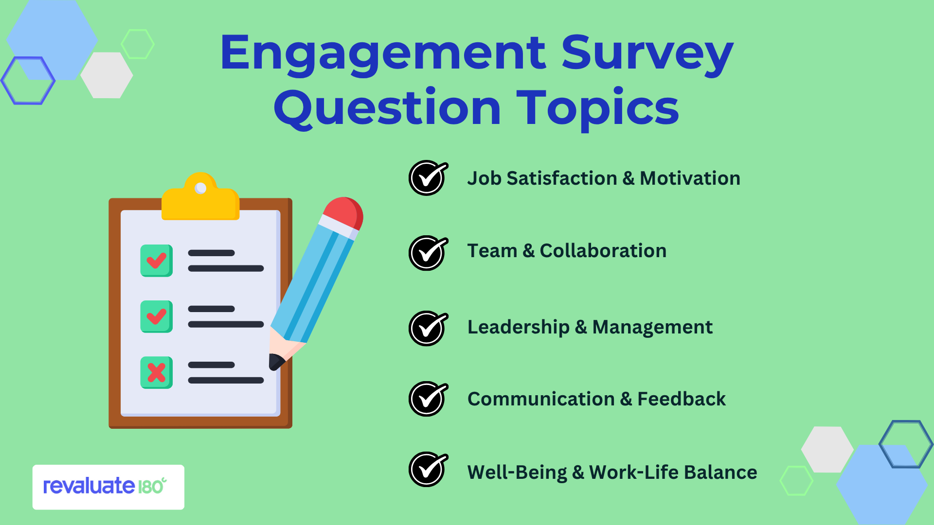 - This guide provides a list of helpful employee engagement survey questions organized into various categories that companies can use during their pulse surveys or annual surveys.