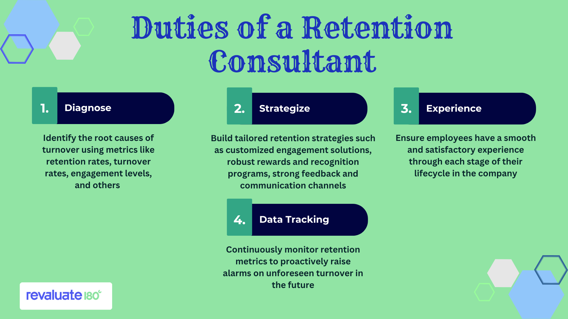Retention consultants guide companies on framing employee retention surveys and occasional stay interviews for all employees. They utilize data analytics and retention software platforms to help identify patterns and derive valuable insights.