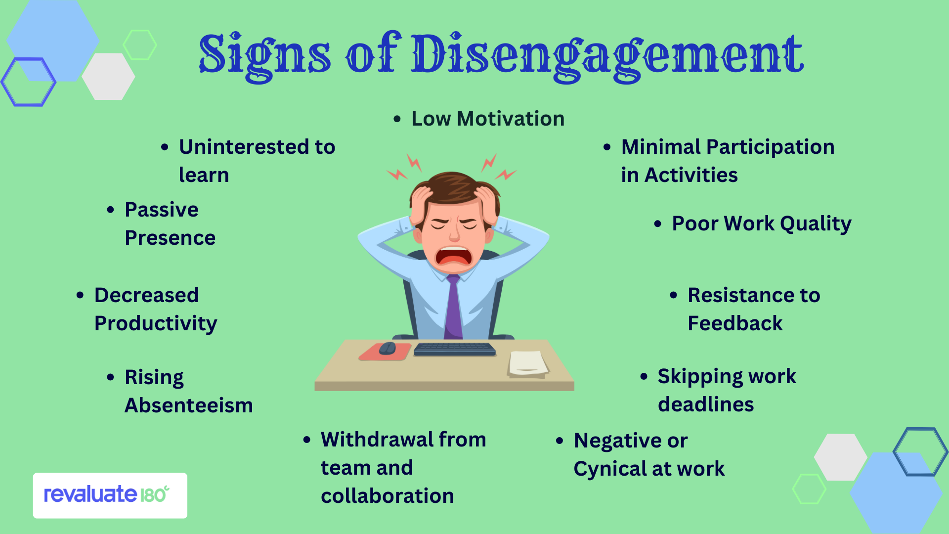 Disengagement in an employee starts with gradual passivity, followed by sudden periods of absenteeism, not participating in team activities and discussions, dodging responsibilities, and arguing over every small thing.