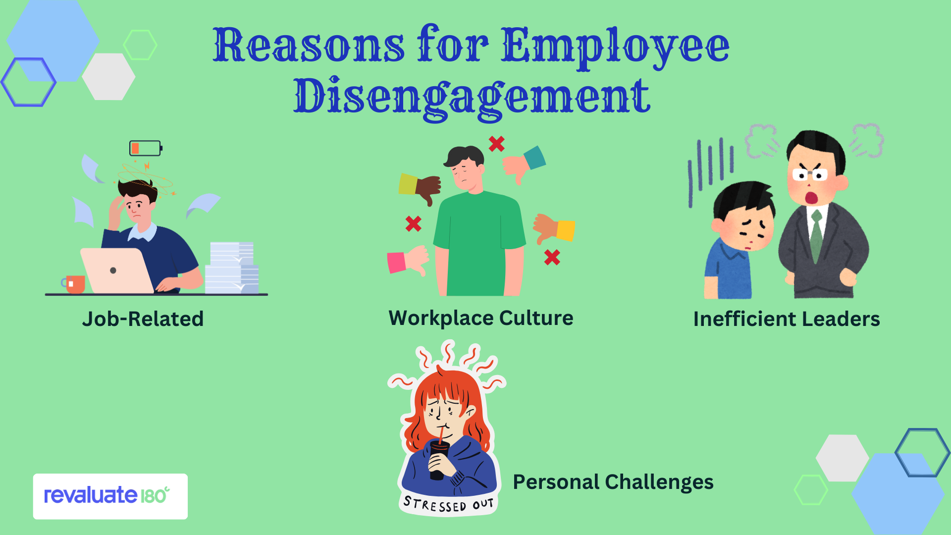 - Common reasons for disengagement include organizational decisions, job role ambiguity, a lack of learning opportunities, poor work-life balance, or a toxic workplace culture.