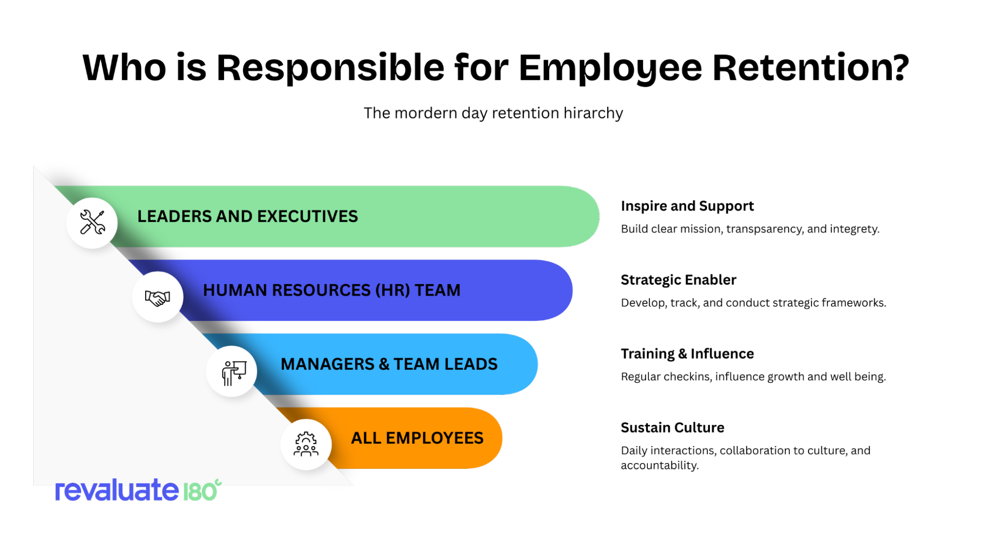 Since employee retention is a collective effort, leaders and managers play the primary role, while every employee contributes to the culture that keeps everyone around them engaged.
